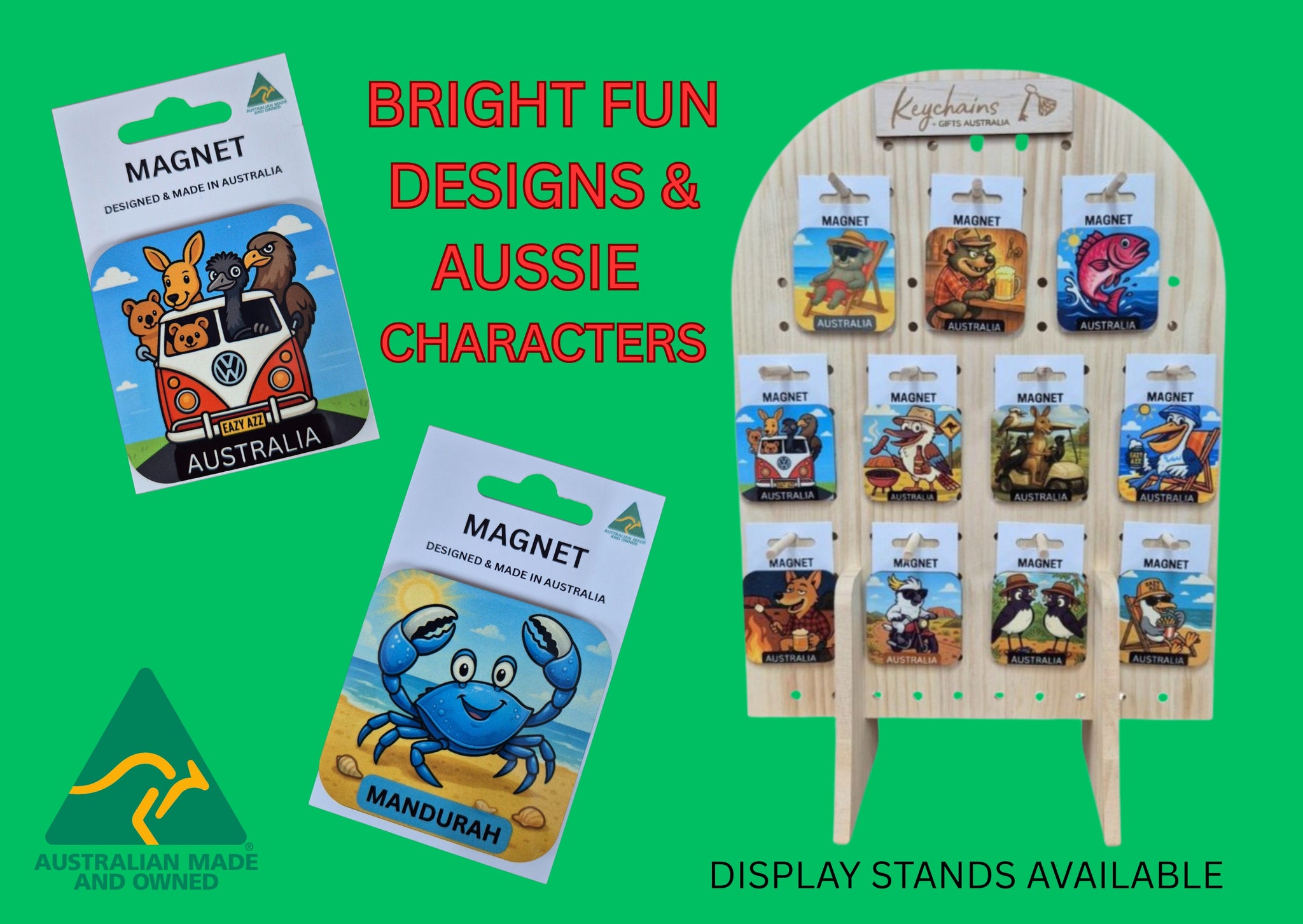 Our standalone stand showcases up to 11 designs simultaneously, making it ideal for retail environments. Each magnet features a premium glossy finish with secure magnetic backing, measuring 6 x 6 cm and presented on branded white hang cards with the Australian Made & Owned certification.