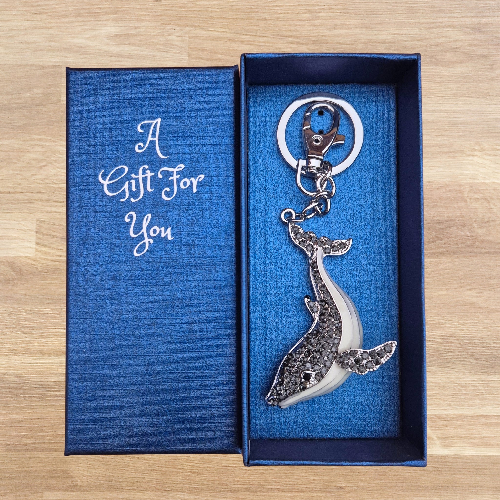 This exquisite humpback whale keychain showcases meticulous hand-painting and black rhinestone detailing for a sophisticated ocean-inspired accessory. Measuring 15cm in total length with the whale figure at 7x5.5cm, it combines premium silver-toned metal with a robust key ring and bag clip mechanism. Each piece arrives beautifully presented in our signature blue A GIFT FOR YOU gift box 6 x 14 cm.
